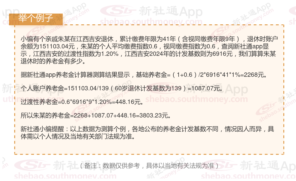 基础养老金:其计算公式为(全省上年度在岗职工月平均工资+本人指数化月平均缴费工资)÷2×缴费年限×1%。其中,本人指数化月平均缴费工资=全省上年度在岗职工月平均工资×本人平均缴费指数(本人平均缴费指数最高为300%,最低为60%,指数在0.6~3之间)。