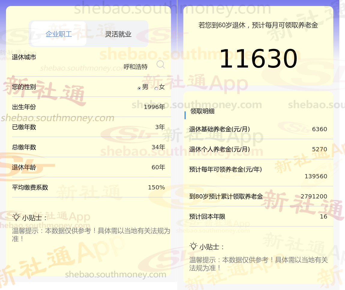 通过新社通APP-养老金计算所得:退休城市、出生年份、退休年龄、缴费系数都相同的情况下,社保缴费年限累计34年时,计算如下: