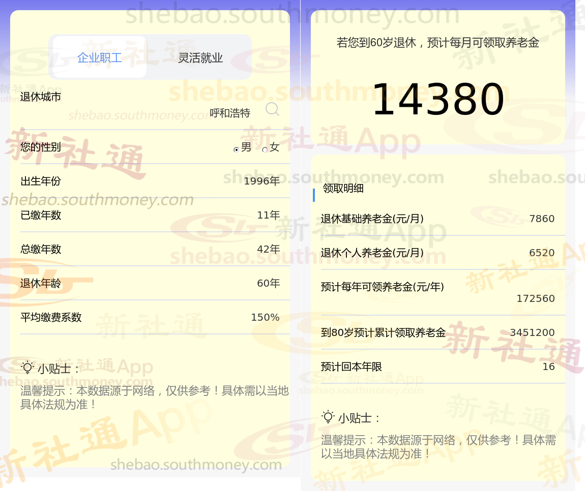 通过新社通APP-养老金计算所得:退休城市、出生年份、退休年龄、缴费系数都相同的情况下,社保缴费年限累计42年时,计算如下: