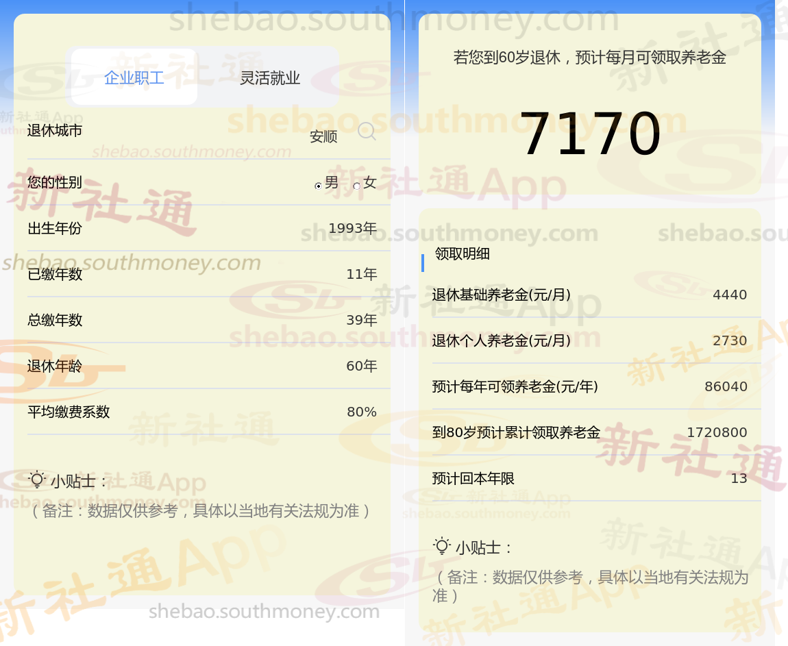 通过新社通APP-养老金计算所得:退休城市、出生年份、退休年龄、缴费系数都相同的情况下,社保缴费年限累计39年时,计算如下: