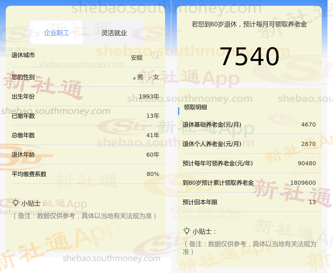 通过新社通APP-养老金计算所得:退休城市、出生年份、退休年龄、缴费系数都相同的情况下,社保缴费年限累计41年时,计算如下: