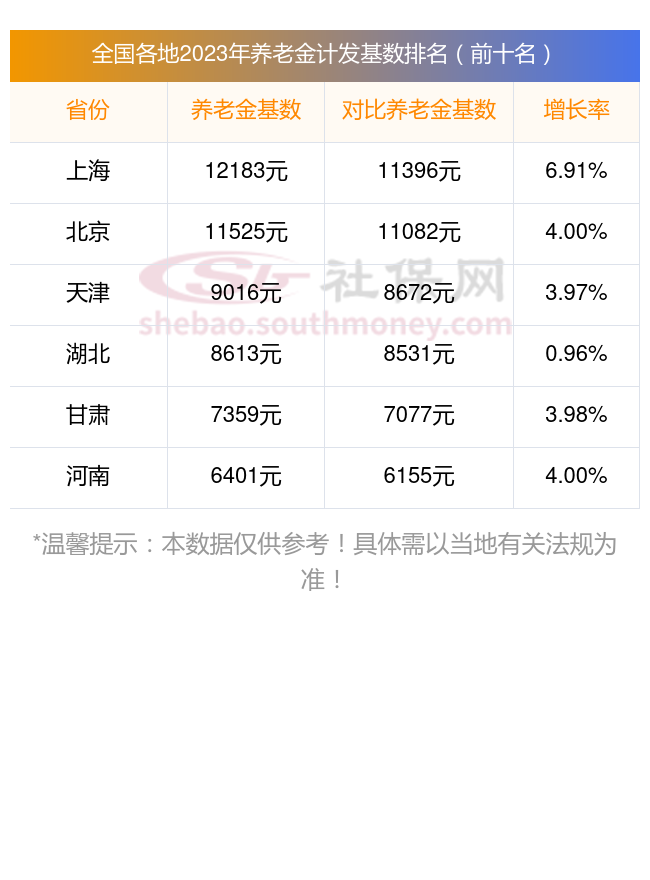 截至目前,2023年全国养老金计发基数排名前十名情况如下