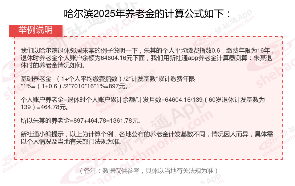 据新社通app获悉: 哈尔滨2025年退休能领多少钱的计算方法如下: