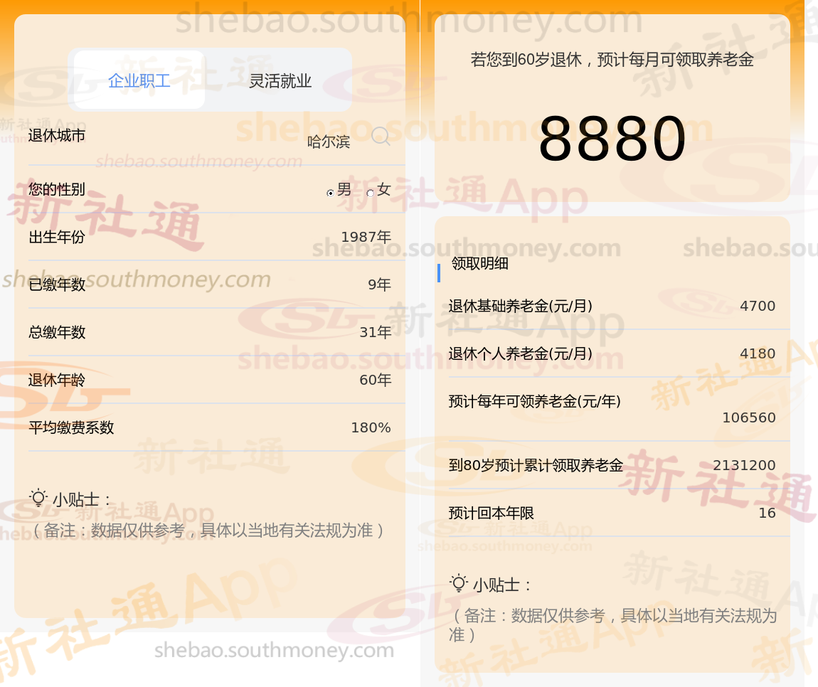 通过新社通APP-养老金计算所得:退休城市、出生年份、退休年龄、缴费系数都相同的情况下,社保缴费年限累计31年时,计算如下: