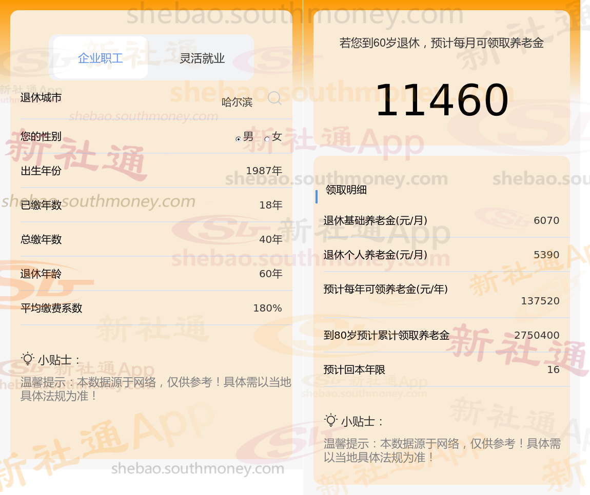 通过新社通APP-养老金计算所得:退休城市、出生年份、退休年龄、缴费系数都相同的情况下,社保缴费年限累计40年时,计算如下: