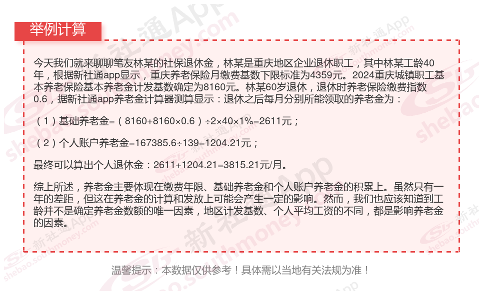 2025重庆退休工资多少钱一个月?据新社通app获悉,养老金无疑是大众瞩目的焦点,特别是对于那些即将或已经步入退休生活的人们而言,其数额的多少直接关系到他们日常生活的舒适程度。随着养老保险体系的逐步深化与改进,养老金的计算方式也在不断地更新调整。退休时间、缴费年限以及缴费基数的差异,均会对最终养老金的数额产生显著影响。因此,了解并适应这些变化,对于确保个人退休后的生活质量至关重要。下面随新社通app小编一起来了解重庆社保退休工资2025计算方法及重庆养老保险要交多少钱吧!