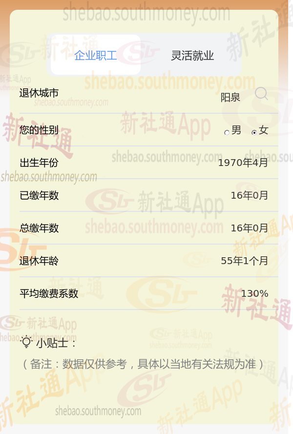 亲戚朱某退休城市在山西阳泉,性别:女,出生年份:1970,缴费档次:130%为例,新社通app养老金计算器预设工资增长率等参数为3%。在此情境下,其退休后能领取的养老金数额需通过计算器精确得出,但基于上述条件,预计数额会相对较低。为获准确估算,建议朱某使用计算工具按要求输入个人信息进行计算,具体数额依个人情况及当地法规而定。