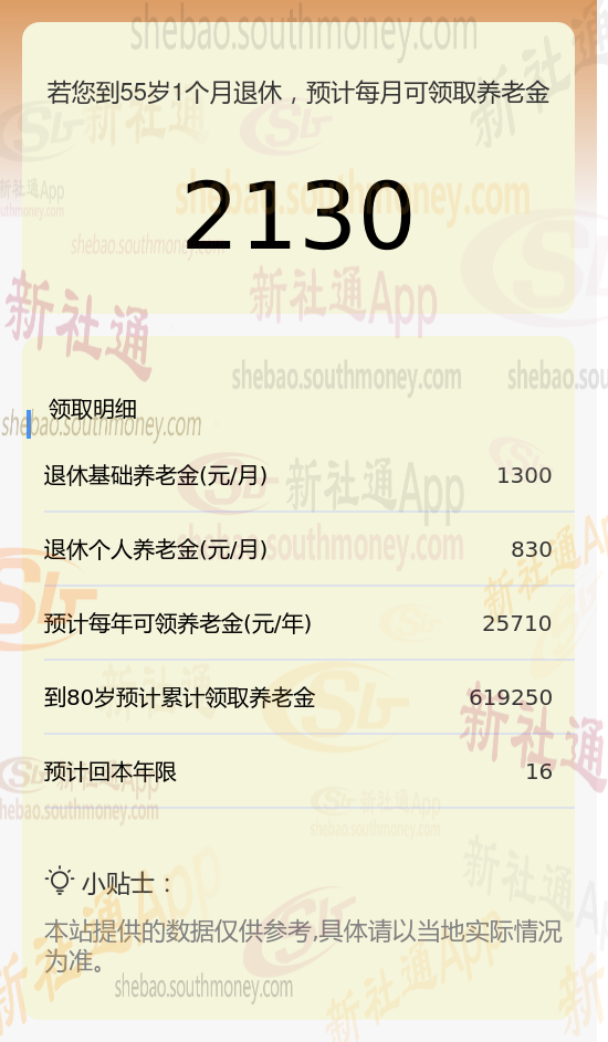现在,我们来计算一下每月可领取的养老金总额。只需将基础养老金的1300元与个人养老金的830元相加,得到的总数就是每月可以领取的养老金,大约是2130元。这个数字象征着您退休后每月可以期待的一笔稳定收入。
