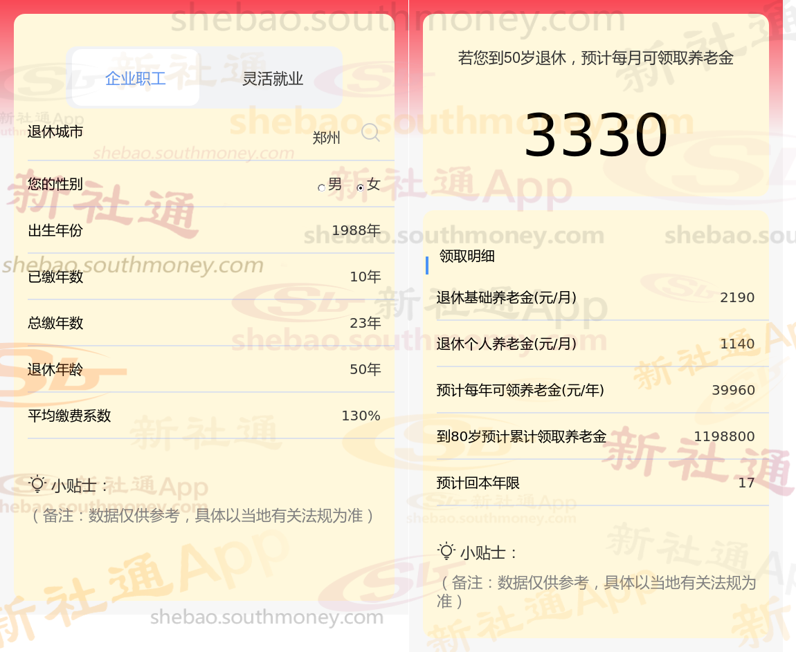 通过新社通APP-养老金计算所得:退休城市、出生年份、退休年龄、缴费系数都相同的情况下,社保缴费年限累计23年时,计算如下: