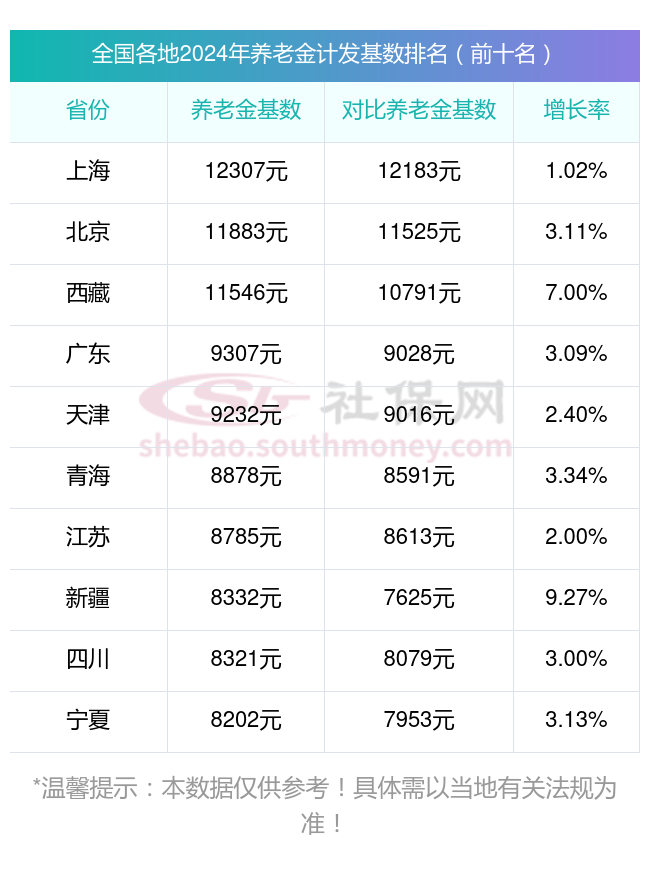 据新社通app显示,2024年上海位列第一位,养老金计发基数达到12307.00元,增长率为1.02%;北京排名第二,养老金计发基数为11883.00元,增长率为3.11%;西藏排名第三,养老金计发基数11546.00元,增长率为7.00%。排名前10的还有:广东、天津、青海、江苏、湖北、新疆、四川。