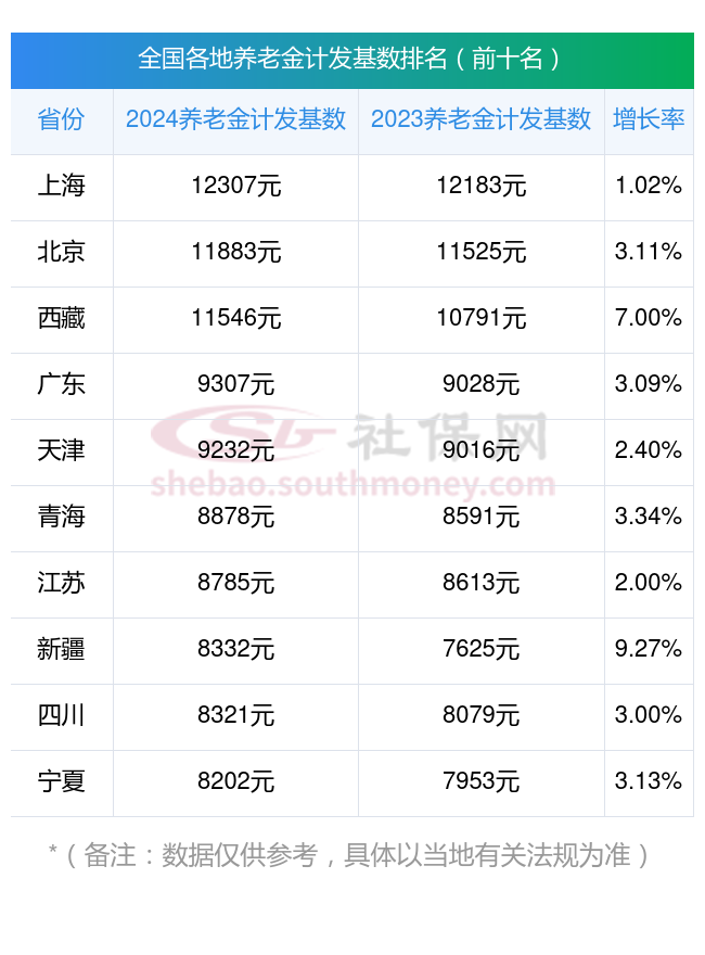 据新社通app显示,2024年上海位列第一位,养老金计发基数达到12307.00元,增长率为1.02%;北京排名第二,养老金计发基数为11883.00元,增长率为3.11%;西藏排名第三,养老金计发基数11546.00元,增长率为7.00%。排名前10的还有:广东(9307.00元,3.09%)、天津(9232.00元,2.40%)、青海(8878.00元,3.34%)、江苏(8785.00元,2.00%)、湖北(8613.00元,0.96%)、新疆(8332.00元,9.27%)、四川(8321.00元,3.00%)。
