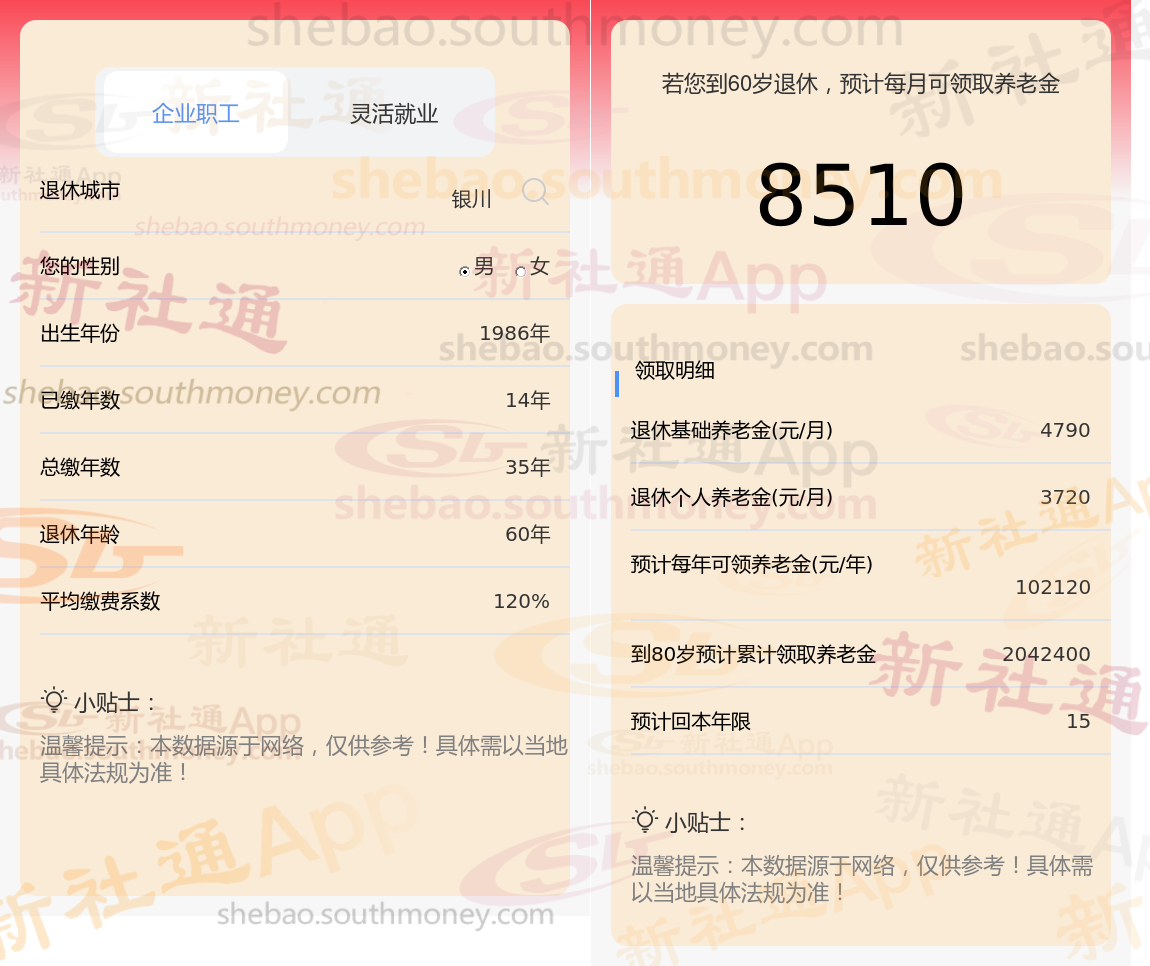 通过新社通APP-养老金计算所得:退休城市、出生年份、退休年龄、缴费系数都相同的情况下,社保缴费年限累计35年时,计算如下: