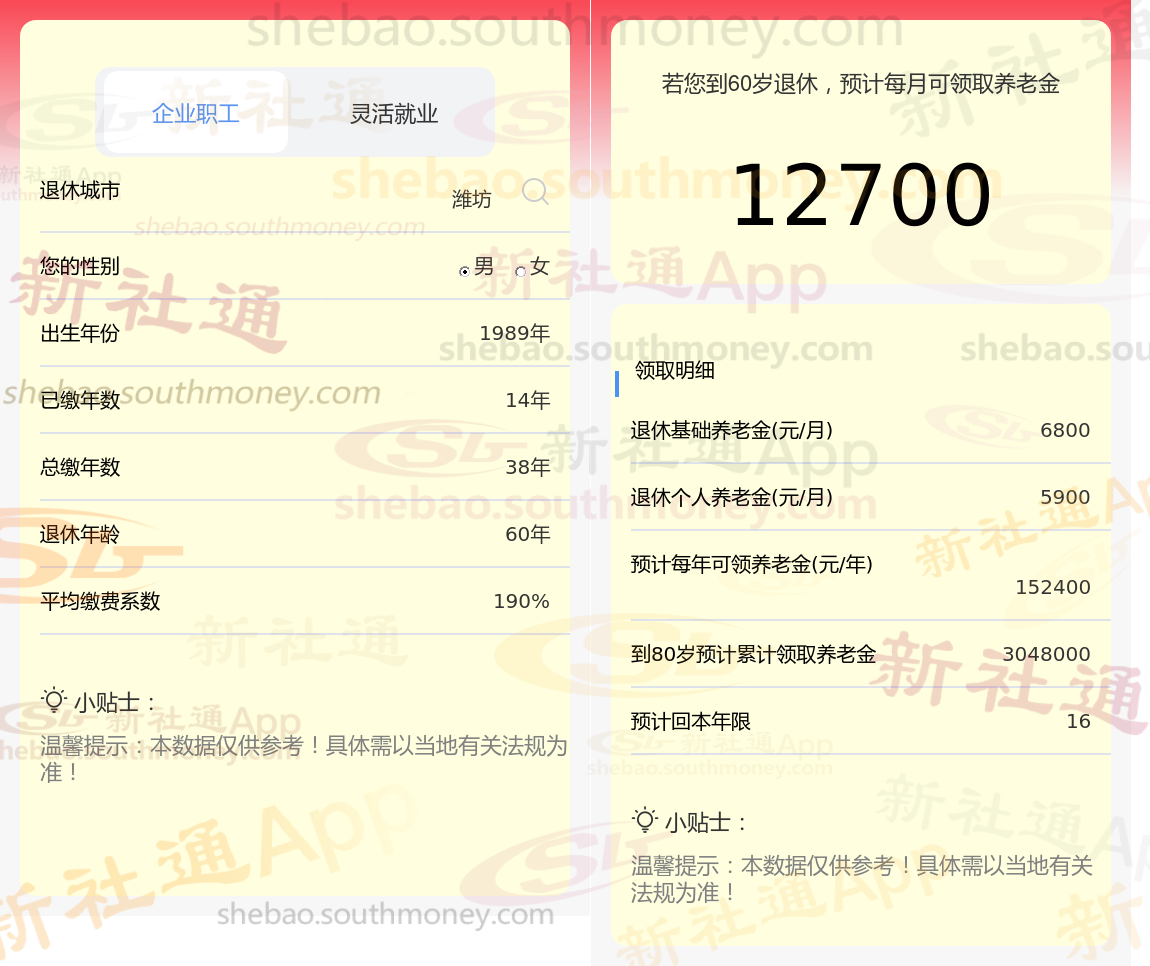 通过新社通APP-养老金计算所得:退休城市、出生年份、退休年龄、缴费系数都相同的情况下,社保缴费年限累计38年时,计算如下: