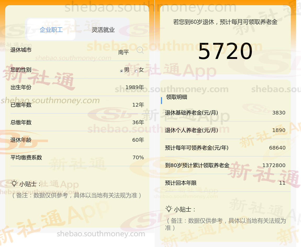 通过新社通APP-养老金计算所得:退休城市、出生年份、退休年龄、缴费系数都相同的情况下,社保缴费年限累计36年时,计算如下: