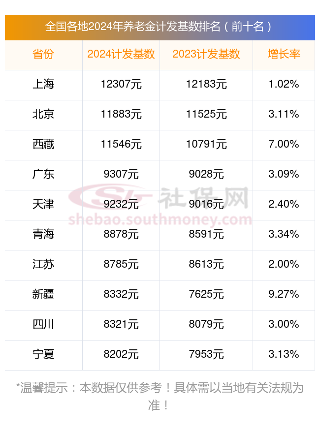 据新社通app显示,下面来看看全国各地2024年养老金计发基数一览表(前十名)