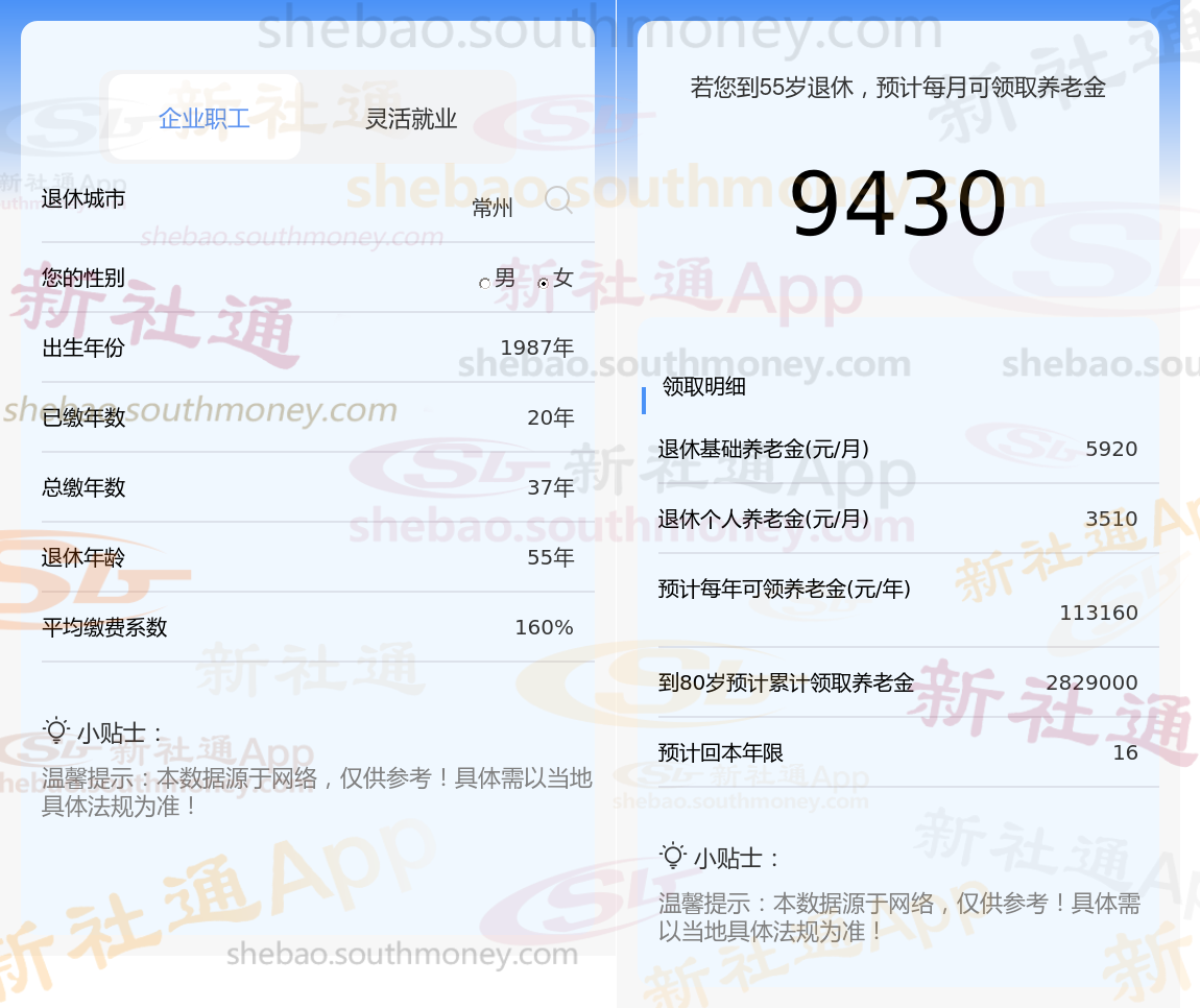 通过新社通APP-养老金计算所得:退休城市、出生年份、退休年龄、缴费系数都相同的情况下,社保缴费年限累计37年时,计算如下: