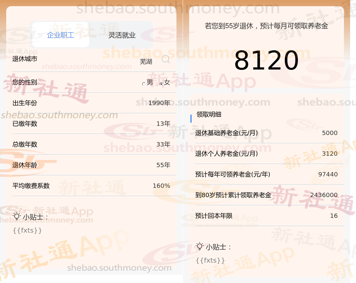 通过新社通APP-养老金计算所得:退休城市、出生年份、退休年龄、缴费系数都相同的情况下,社保缴费年限累计33年时,计算如下: