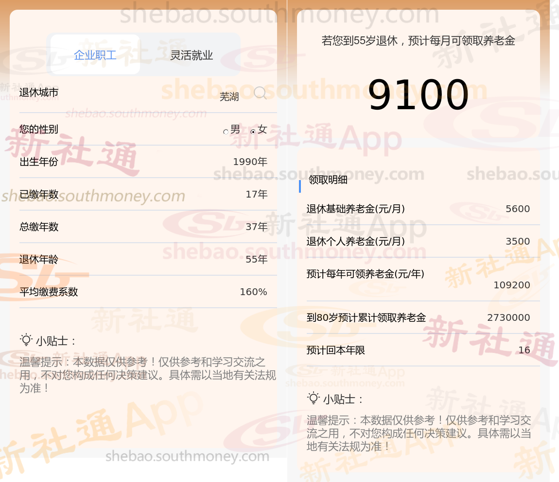 通过新社通APP-养老金计算所得:退休城市、出生年份、退休年龄、缴费系数都相同的情况下,社保缴费年限累计32年时,计算如下: