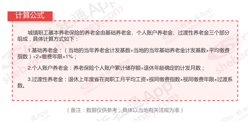 个人养老金=养老保险个人账户累计储存额÷退休年龄确定的计发月数(养老保险计发月数: 50岁195个月、55岁170个月、60岁139个月 )≈1840元