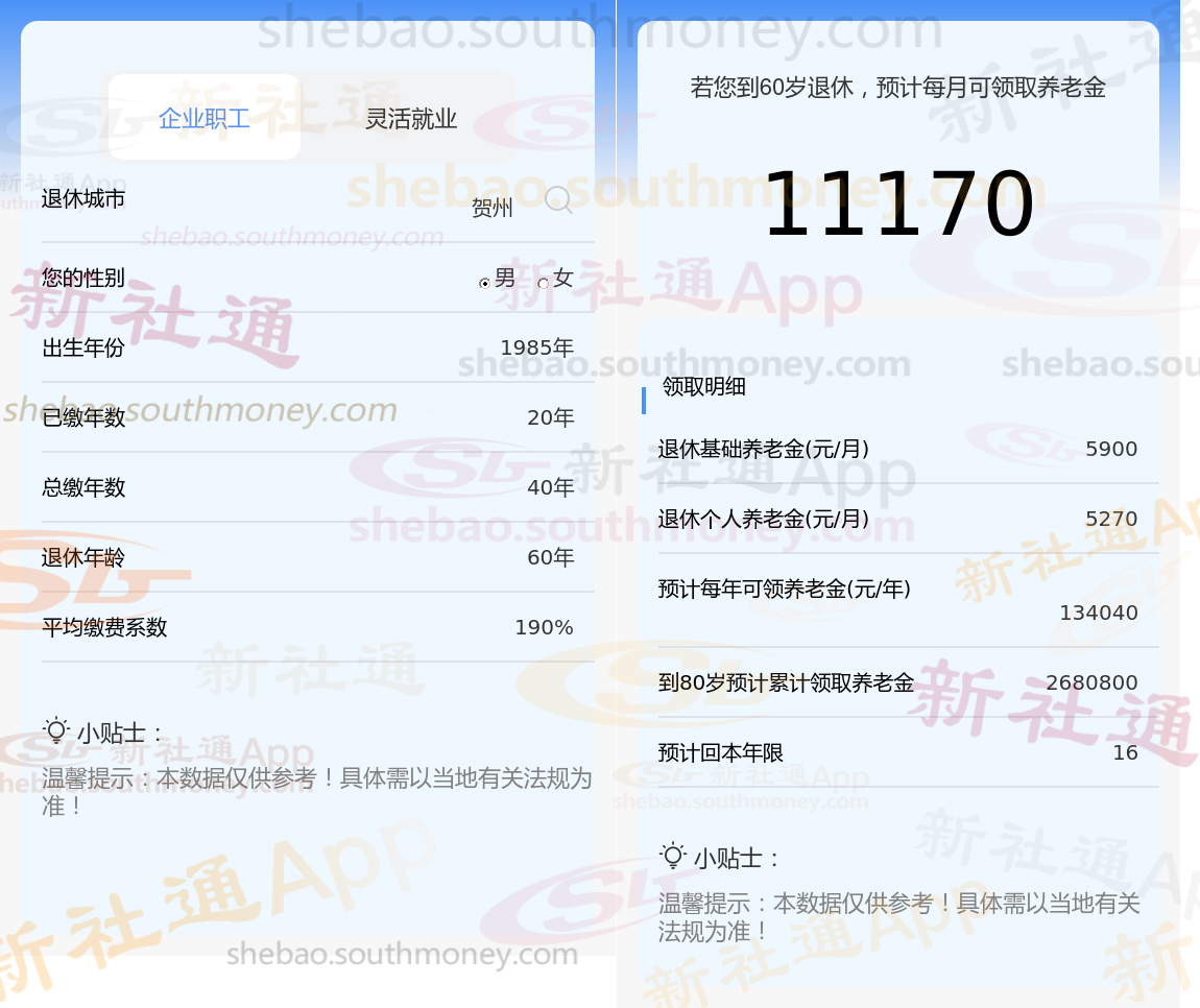 通过新社通APP-养老金计算所得:退休城市、出生年份、退休年龄、缴费系数都相同的情况下,社保缴费年限累计40年时,计算如下: