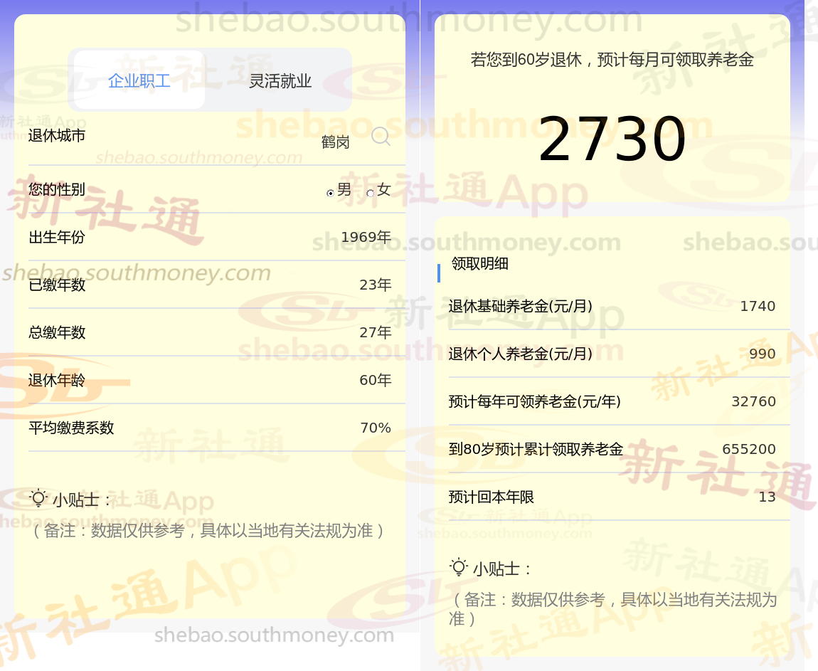 通过新社通APP-养老金计算所得:退休城市、出生年份、退休年龄、缴费系数都相同的情况下,社保缴费年限累计27年时,计算如下: