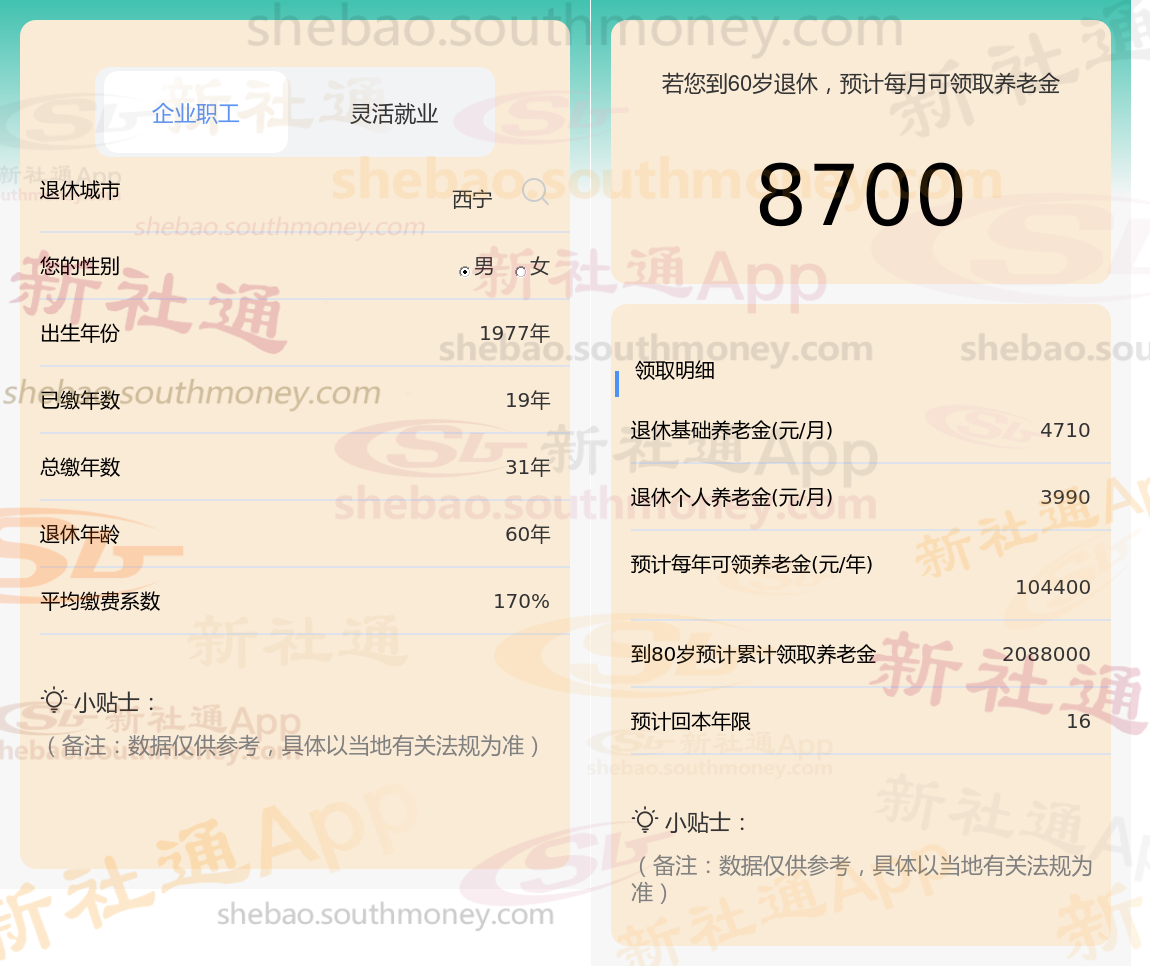 通过新社通APP-养老金计算所得:退休城市、出生年份、退休年龄、缴费系数都相同的情况下,社保缴费年限累计33年时,计算如下: