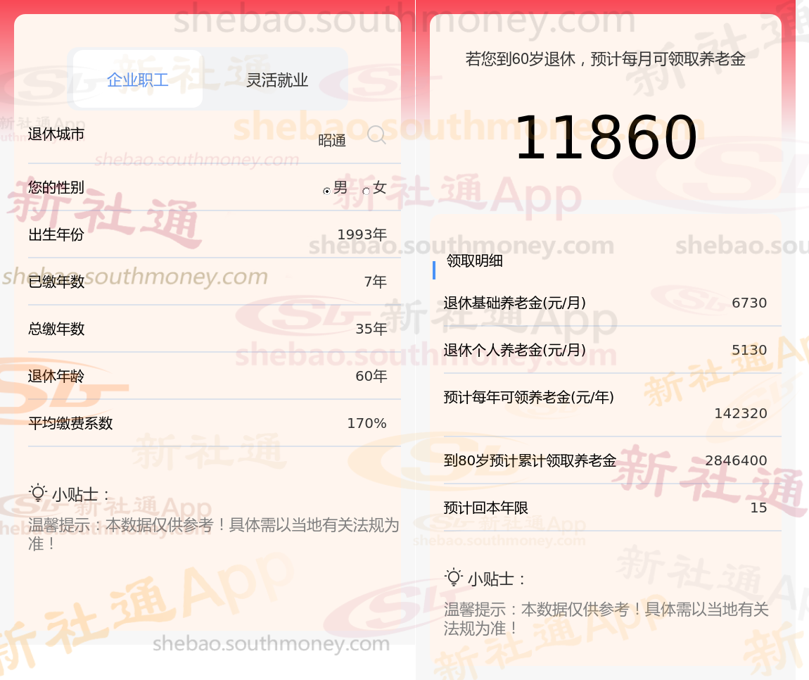 通过新社通APP-养老金计算所得:退休城市、出生年份、退休年龄、缴费系数都相同的情况下,社保缴费年限累计35年时,计算如下: