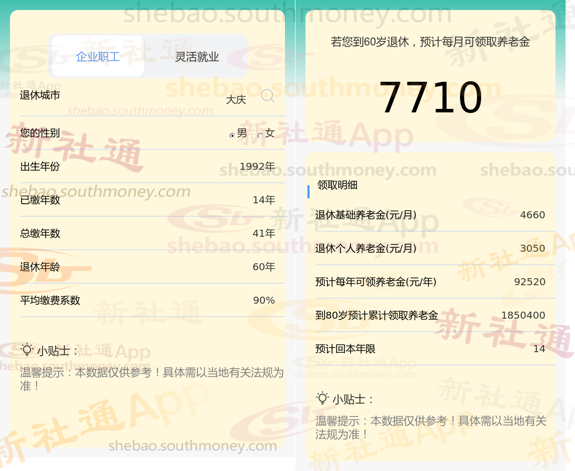 通过新社通APP-养老金计算所得:退休城市、出生年份、退休年龄、缴费系数都相同的情况下,社保缴费年限累计41年时,计算如下: