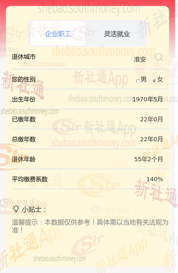 以淮安1970年女性孔某为例,假设其社保缴费档次为140%缴纳社保,社保网app养老金计算器预设工资增长率等参数为3%。在此情境下,其退休后能领取的养老金数额可以通过计算器测算得出,但基于上述条件,预计数额会相对较低。为获相对准的测算结果,建议他使用新社通app养老金计算器输入个人信息进行计算,具体数额依个人情况及当地法规而定。