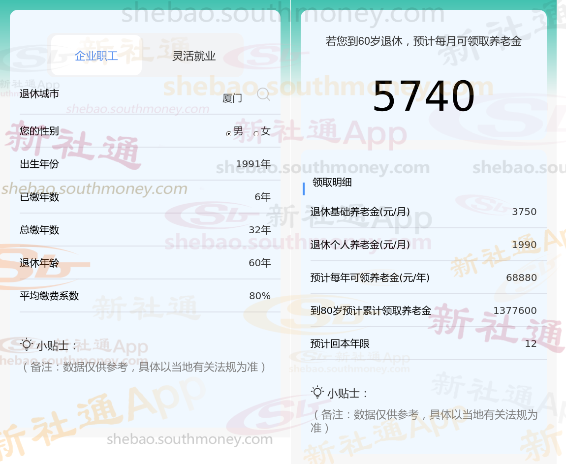 通过新社通APP-养老金计算所得:退休城市、出生年份、退休年龄、缴费系数都相同的情况下,社保缴费年限累计32年时,计算如下:
