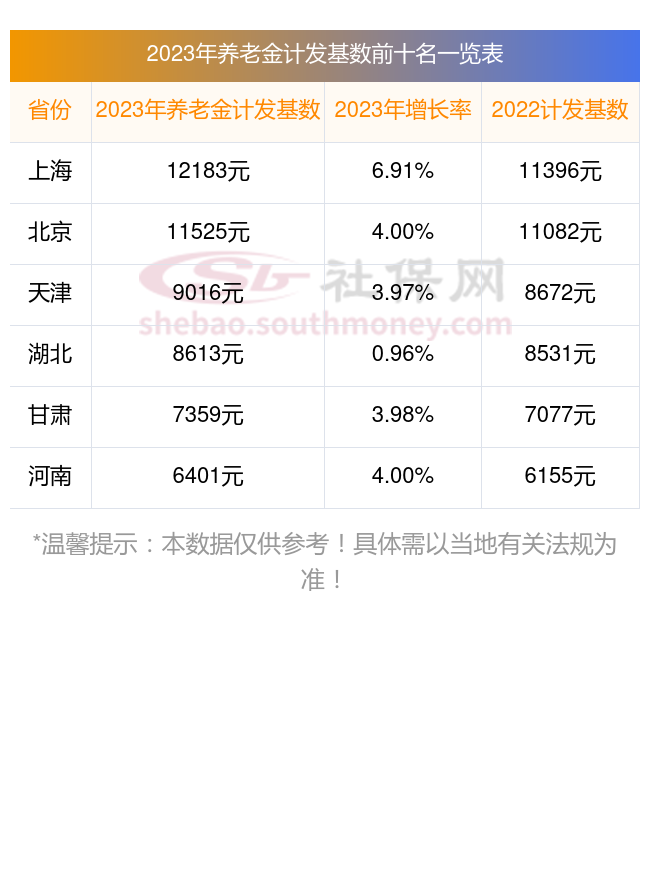 下面看看2023-2024年全国各地养老金计发基数排名前十