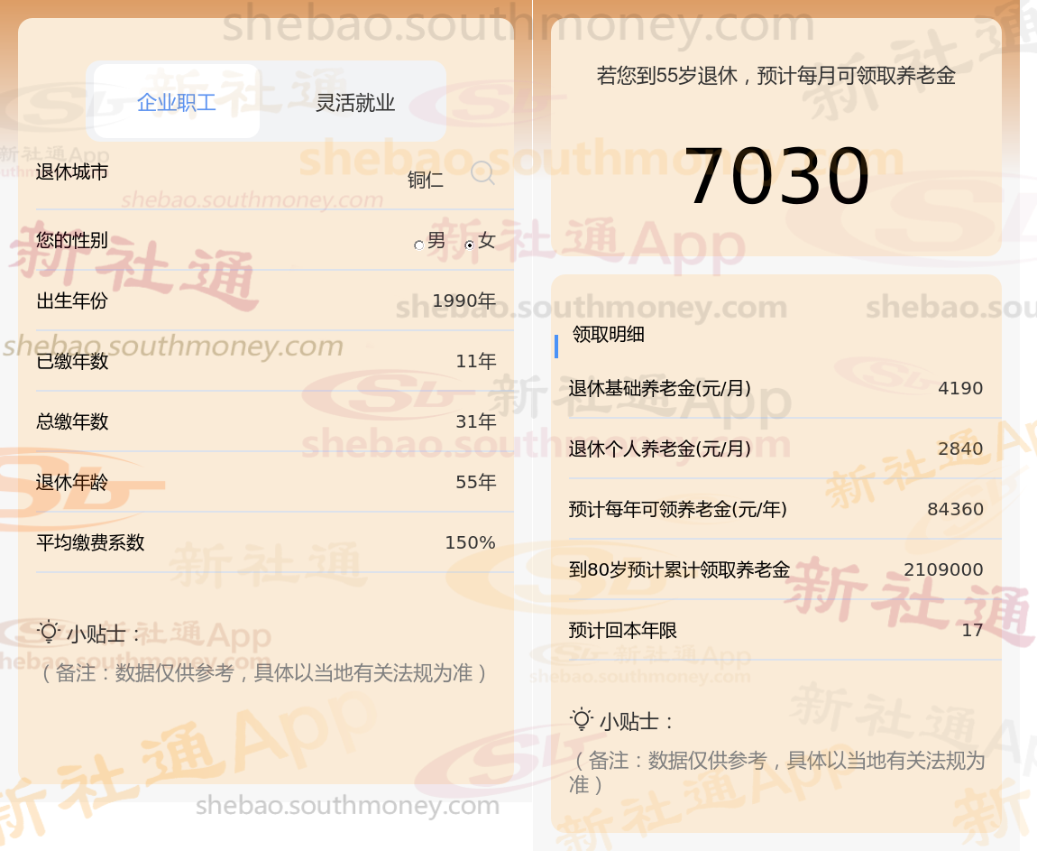 通过新社通APP-养老金计算所得:退休城市、出生年份、退休年龄、缴费系数都相同的情况下,社保缴费年限累计31年时,计算如下: