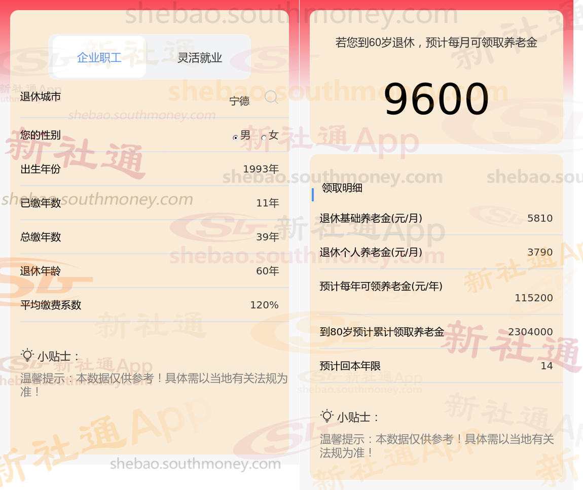 通过新社通APP-养老金计算所得:退休城市、出生年份、退休年龄、缴费系数都相同的情况下,社保缴费年限累计39年时,计算如下: