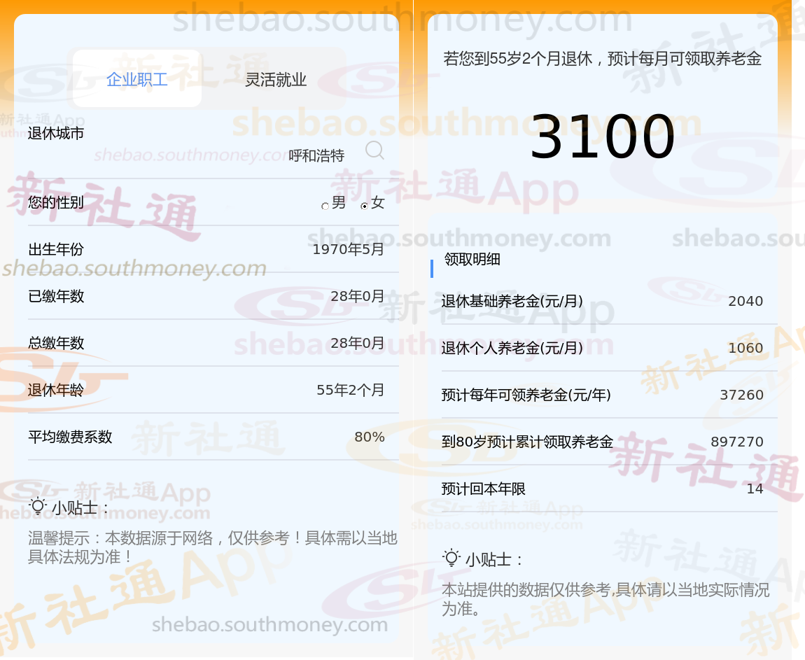 个人档案:女性,1970年出生,呼和浩特退休职工,社保缴费28载,档次80%。