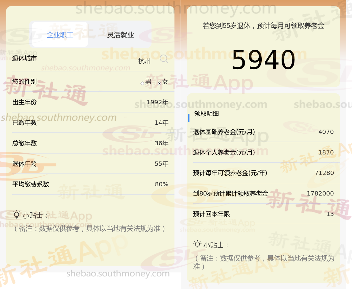 通过新社通APP-养老金计算所得:退休城市、出生年份、退休年龄、缴费系数都相同的情况下,社保缴费年限累计36年时,计算如下: