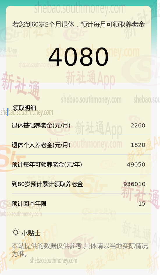 基础退休金:基本养老金是我们退休后最主要的收入来源,由基本养老保险基金支付。它的计算公式为:每月基本养老金=(基本养老金计发基数+指数化月平均缴费工资)÷2×缴费年限×1%。每月大约2260元。