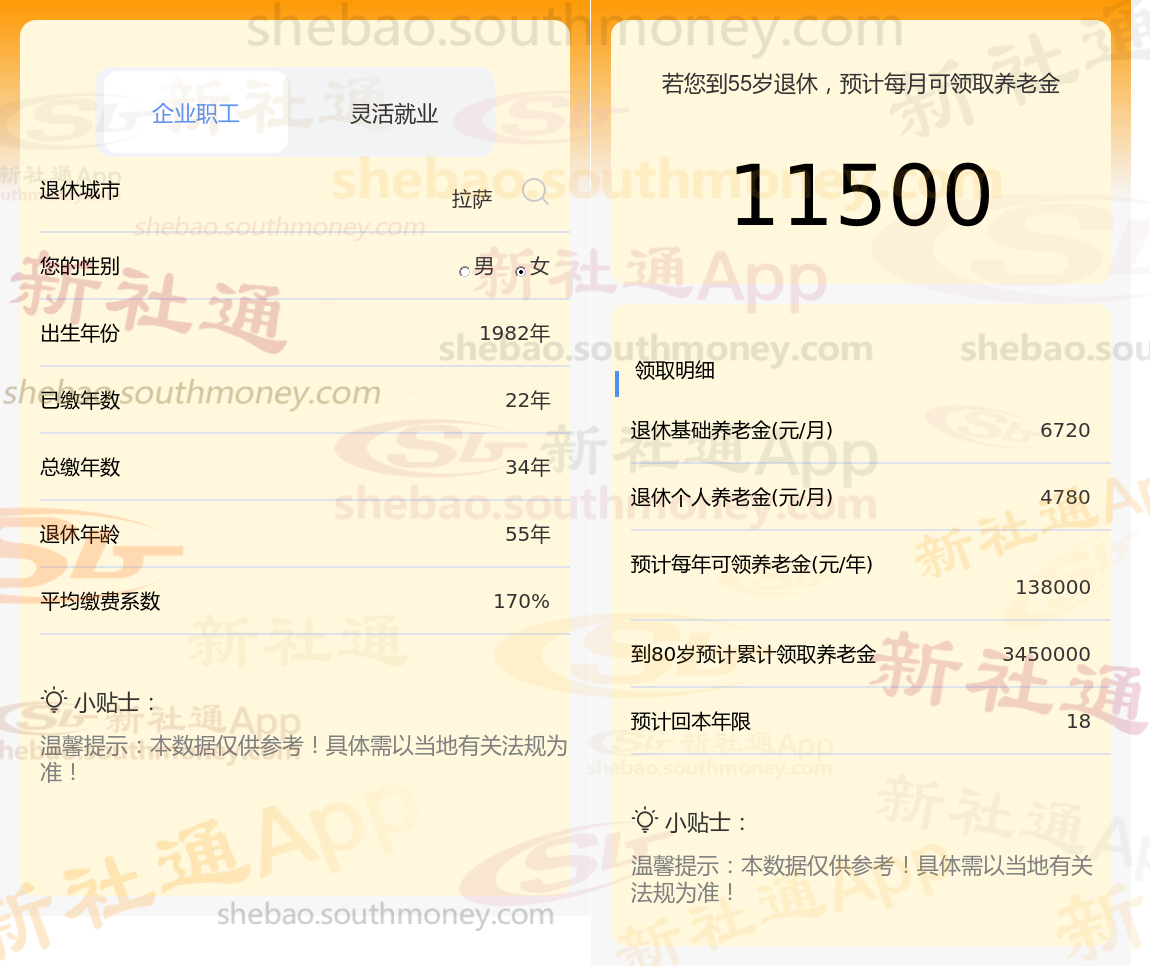 通过新社通APP-养老金计算所得:退休城市、出生年份、退休年龄、缴费系数都相同的情况下,社保缴费年限累计34年时,计算如下: