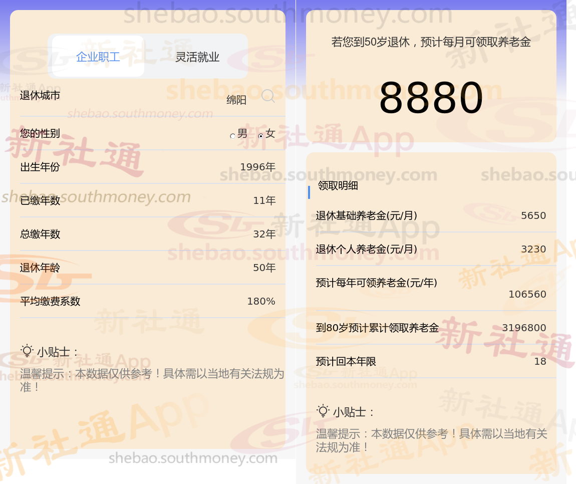 通过新社通APP-养老金计算所得:退休城市、出生年份、退休年龄、缴费系数都相同的情况下,社保缴费年限累计32年时,计算如下: