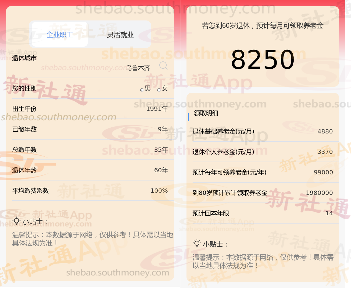 通过新社通APP-养老金计算所得:退休城市、出生年份、退休年龄、缴费系数都相同的情况下,社保缴费年限累计35年时,计算如下: