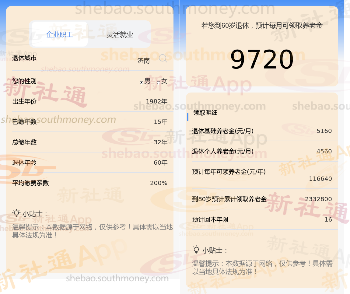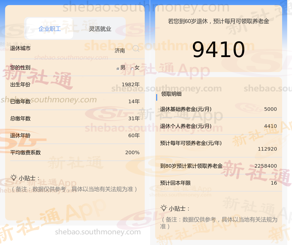 查阅新社通app显示,济南养老金=基础养老金+个人账户养老金