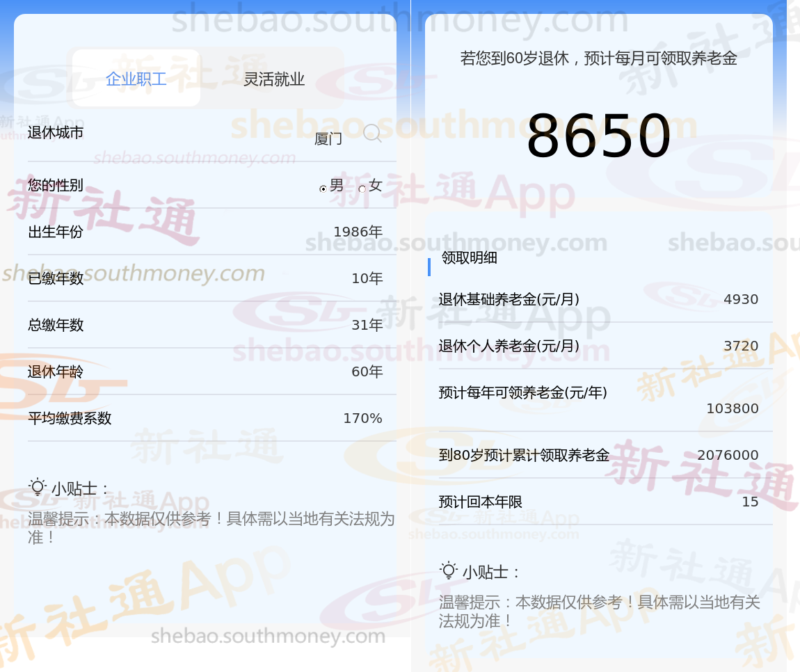 通过新社通APP-养老金计算所得:退休城市、出生年份、退休年龄、缴费系数都相同的情况下,社保缴费年限累计31年时,计算如下:
