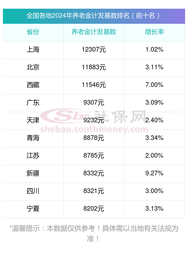 据新社通app显示,2024年上海位列第一位,养老金计发基数达到12307.00元,增长率为1.02%;北京排名第二,养老金计发基数为11883.00元,增长率为3.11%;西藏排名第三,养老金计发基数11546.00元,增长率为7.00%。排名前10的还有:广东(9307.00元,3.09%)、天津(9232.00元,2.40%)、青海(8878.00元,3.34%)、江苏(8785.00元,2.00%)、湖北(8613.00元,0.96%)、新疆(8332.00元,9.27%)、四川(8321.00元,3.00%)。