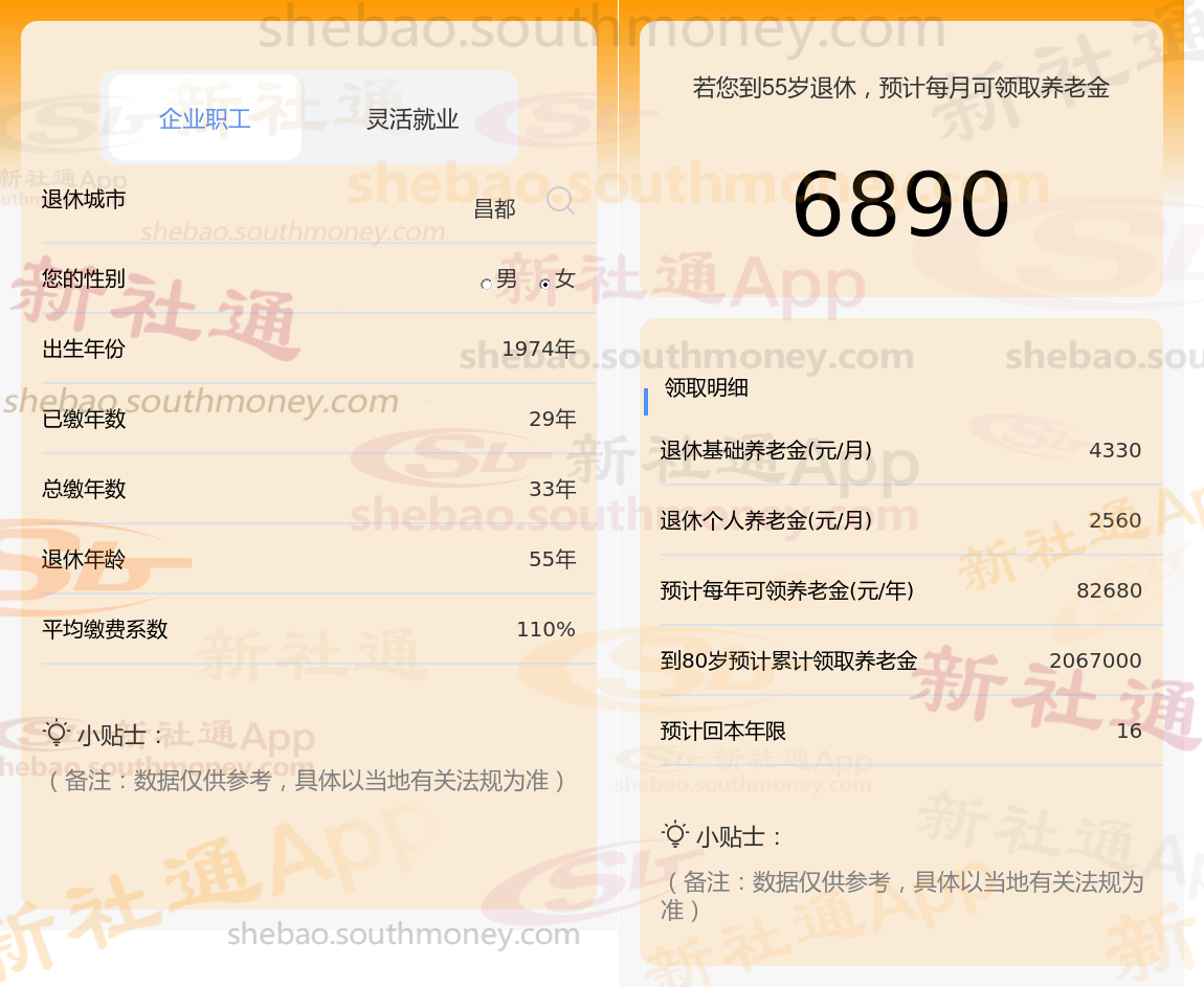 通过新社通APP-养老金计算所得:退休城市、出生年份、退休年龄、缴费系数都相同的情况下,社保缴费年限累计33年时,计算如下: