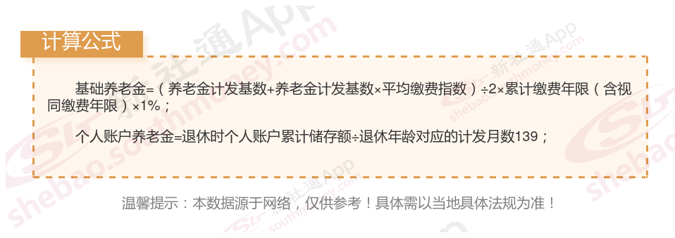 基本养老金计算公式为:(退休时上年度全市城镇单位就业人员月平均工资+本人指数化月平均缴费工资)÷2×缴费年限×1%。每月大约3210元。