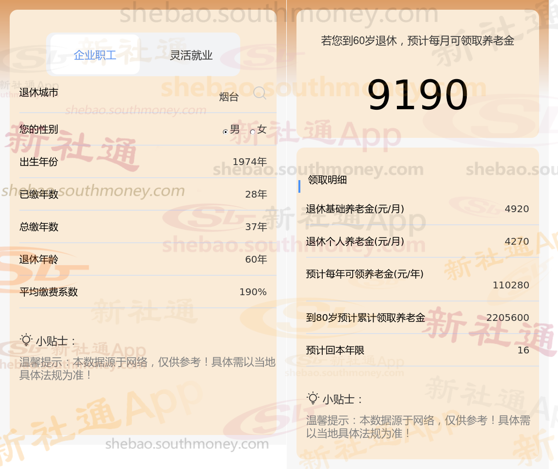 据新社通app小编了解,养老金多少和工龄/缴费年限息息相关,那么,2025年烟台退休养老金计算公式是怎样?社保交37年、38年、41年,退休金差别有多大?