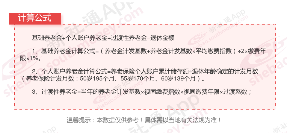 过渡性养老金(适用于特定人群):具体计算方法因地区而异,需参照当地法规执行。