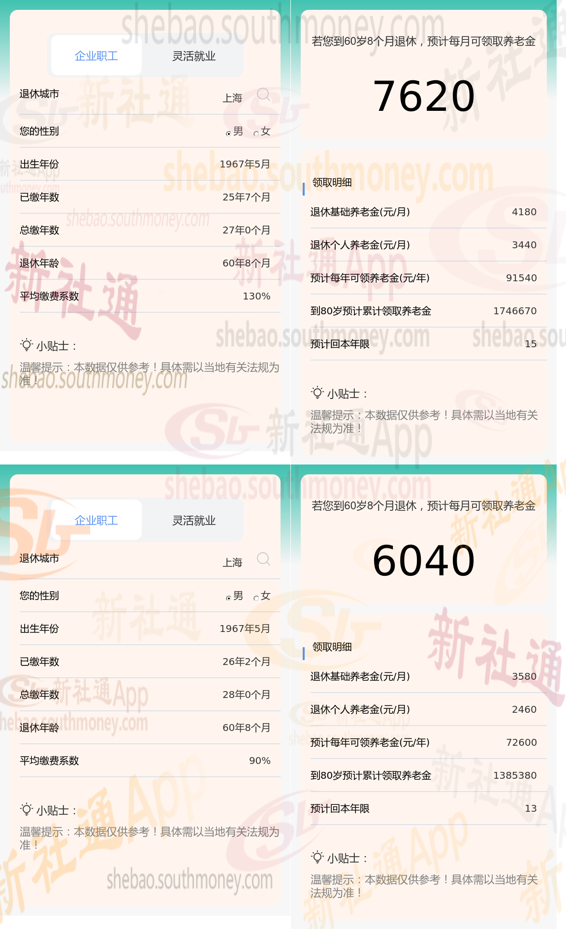 新社通app养老金计算器,轻松测算您的养老金!:康某与老魏的差别,缴费年限、缴费档位不同的情况下,差别7620-6040=1580元。通过选择提高缴费档位及拉长缴费年限,都可以为未来的退休生活奠定更加坚实的经济基础。当然增加缴费金额意味着在现有缴费标准上选择更高的档次进行缴纳,这样做能够积累更多的个人账户资金,并在达到法定退休年龄时,根据‘多缴多得’的原则,领取到更为丰厚的退休金。这是一种前瞻性的规划方式,旨在确保您的退休生活品质,让您能够享受更加宽裕、安心的晚年时光。