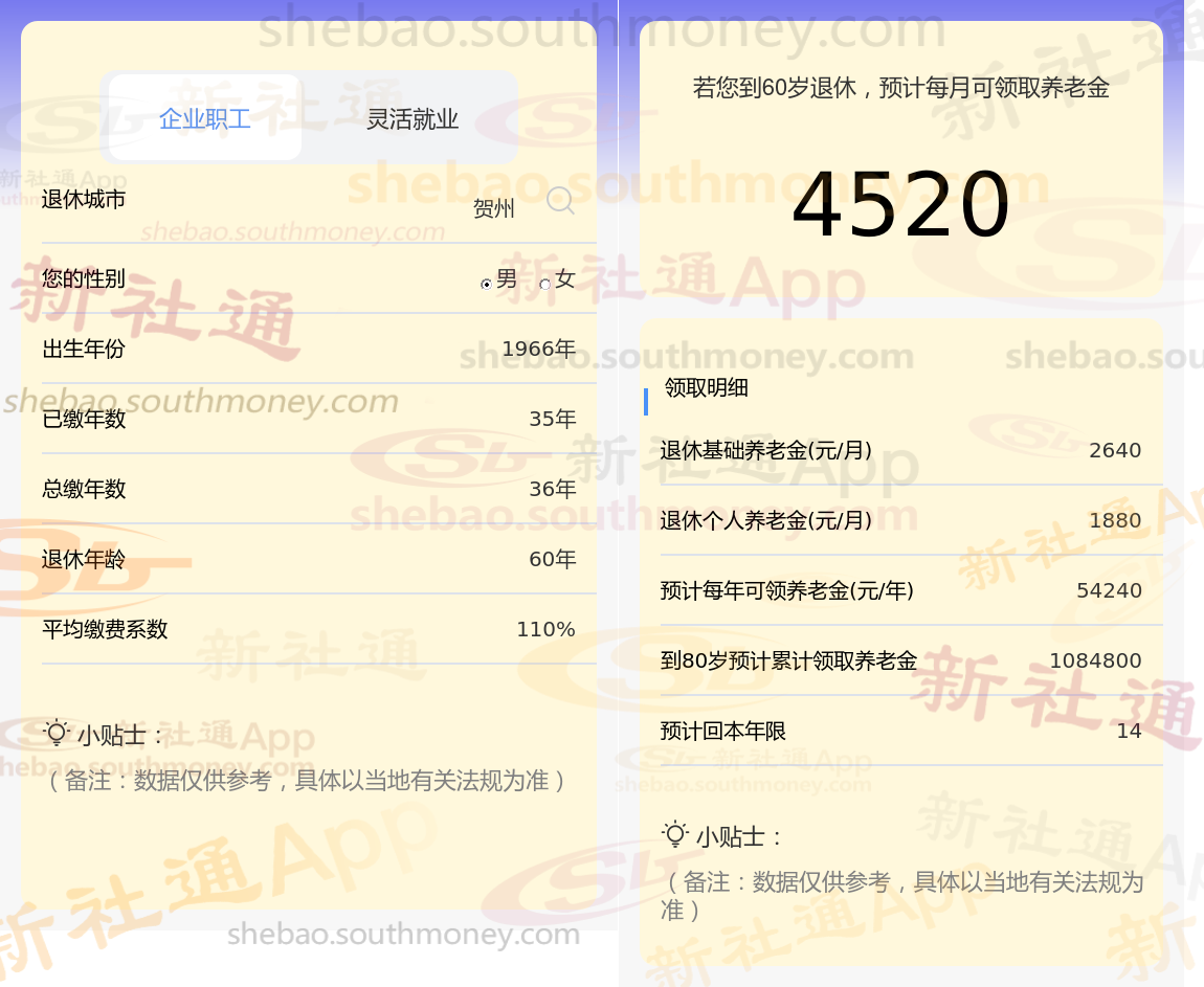 通过新社通APP-养老金计算所得:退休城市、出生年份、退休年龄、缴费系数都相同的情况下,社保缴费年限累计36年时,计算如下: