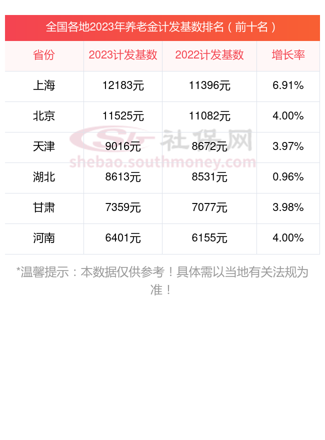 截至目前,2023年全国养老金计发基数排名前十名情况如下