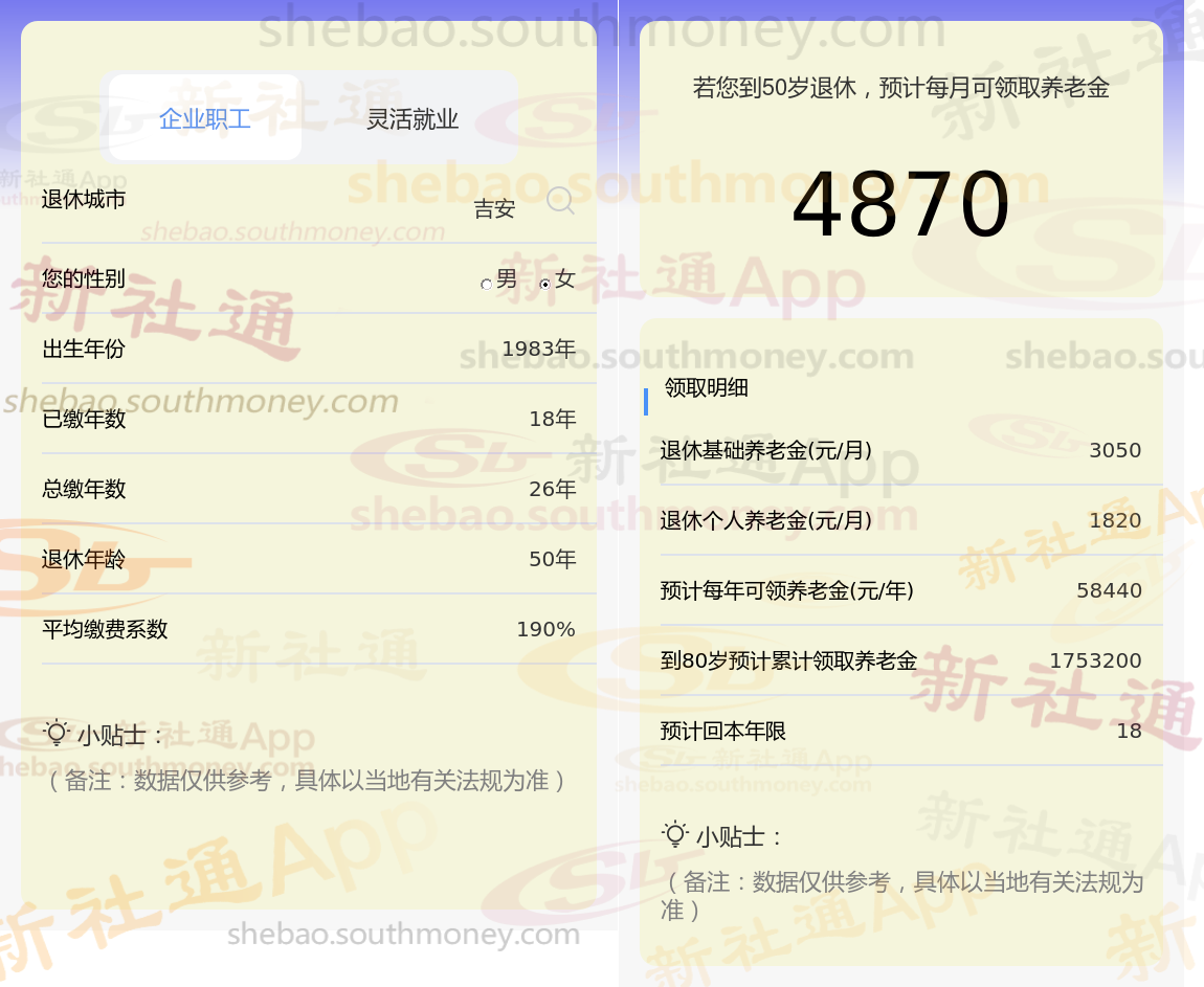通过新社通APP-养老金计算所得:退休城市、出生年份、退休年龄、缴费系数都相同的情况下,社保缴费年限累计26年时,计算如下: